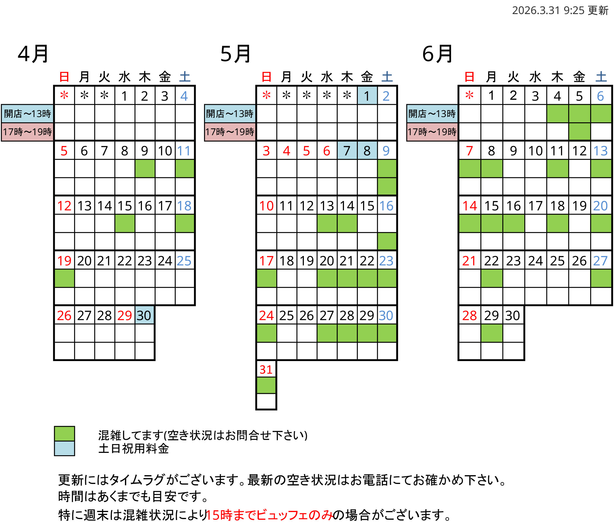 ※土曜日・日曜日の昼食(ランチ)や夕食(ディナー)の時間は大変混雑しております。